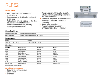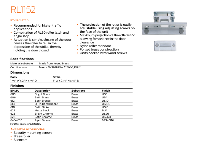Ives has multiple roller latches and catches that assure a door will stay closed when not in use. These accessories will not keep a door secure and are not meant for security applications; they only help keep a door closed. Ives also offers a variety of surface bolts and door guards to provide an additional security level.