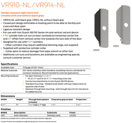 For use with Von Duprin 98/99 Series rim and vertical rod exit device