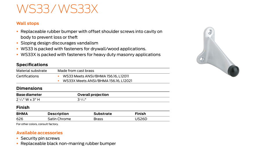 With a full line of wall bumpers, wall holders, kick down holders and hinge pin stops, Ives products are designed to ensure that doors will not slam into the wall. These accessories are typically found on doors without an overhead stop or holder.