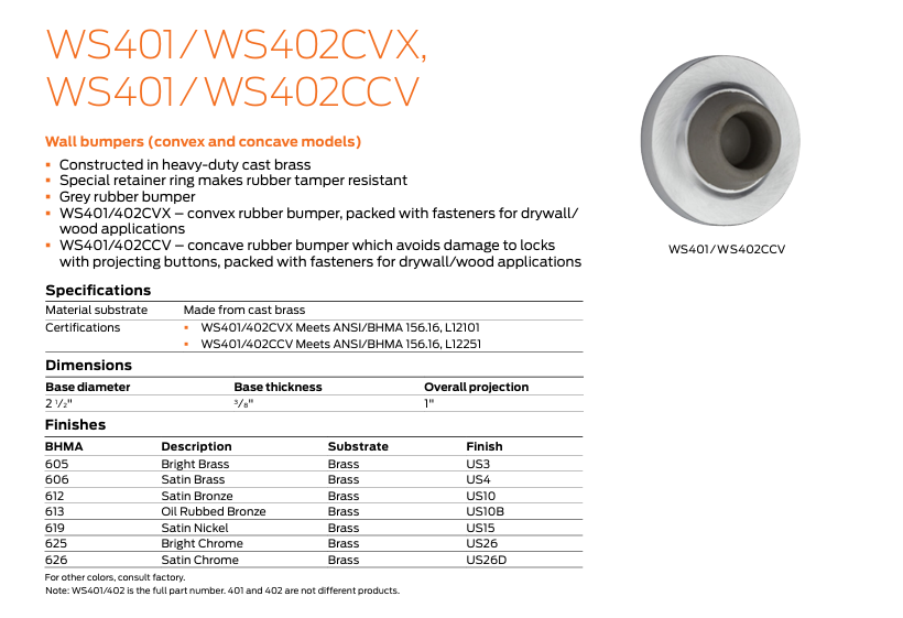 - WS401/402CVX – convex rubber bumper, packed with fasteners for drywall/wood applications.