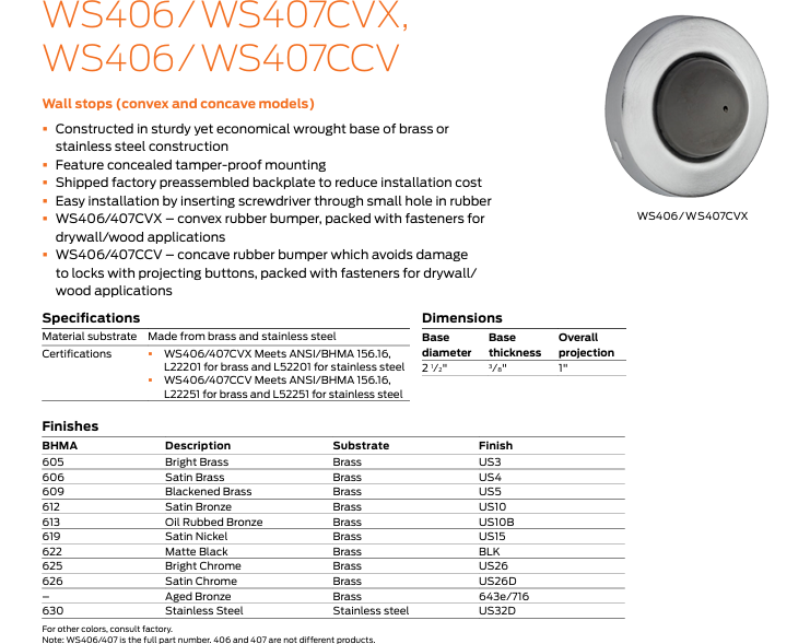- WS406/407CVX – convex rubber bumper, packed with fasteners for drywall/wood