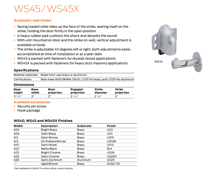With a full line of wall bumpers, wall holders, kick down holders and hinge pin stops, Ives products are designed to ensure that doors will not slam into the wall. These accessories are typically found on doors without an overhead stop or holder.