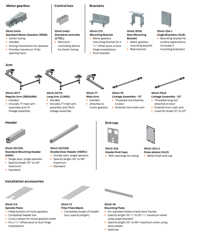 The low-energy electromechanical Senior Swing Series operators are LCN’s heaviest-duty version for high-abuse and high-traffic areas. The Senior Swing Series is backed by a 2-year limited warranty, is UL listed, meets ANSI/BHMA 156.19, the American Disabilities Act (ADA) and ANSI A117.1 requirements for accessibility.