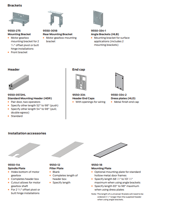 Both the 9500 and 2800 Series ship with a standard header and optional customizable header lengths are offered. The power boost provides additional closing force in severe wind. Push ‘N Go non-switch activation takes over when a pedestrian manually opens the door to 5°, then holds the door fully open for 1-30 seconds, depending on the time delay.