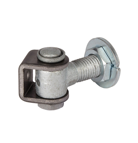 Vandal-proof hot-dip galvanized 90° hinge. This hinge is the perfect solution for all your small industrial gates. The eyebolt can not be tampered with when the gate is closed. With the LR welding nut you can easily adjust the hinge.
