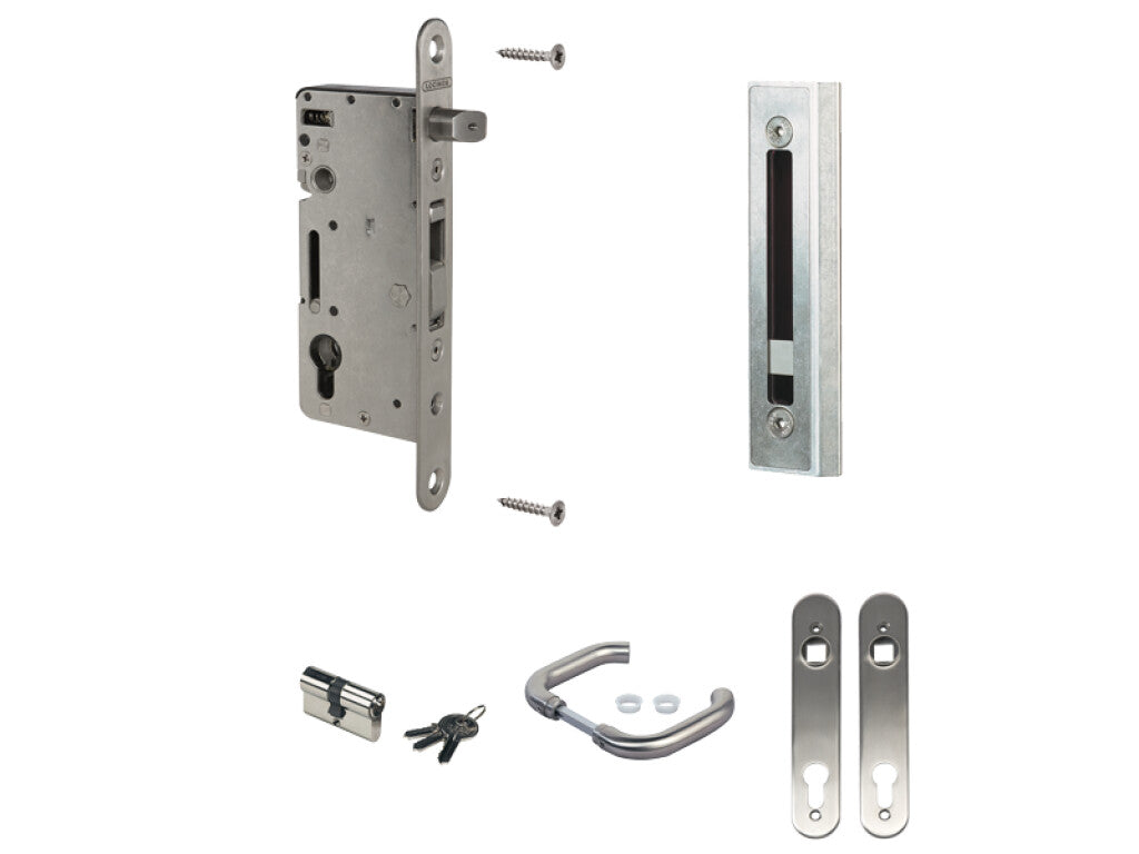 - Complete set with lock, keep, cover plates, handles and cylinder
