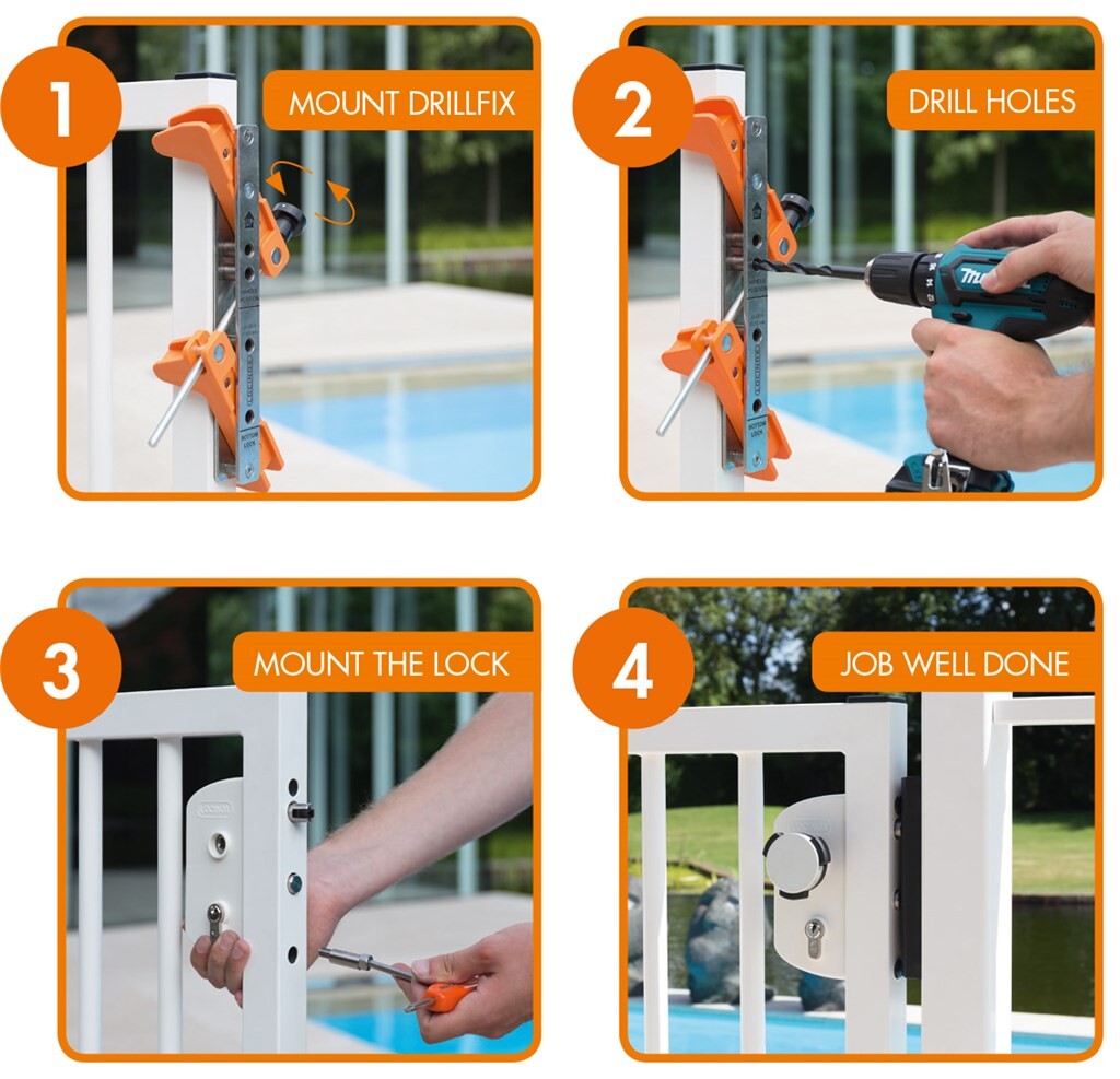- Tool case with self-centering drilling tool for fast assembly of Locinox surface mounted gate locks and keeps