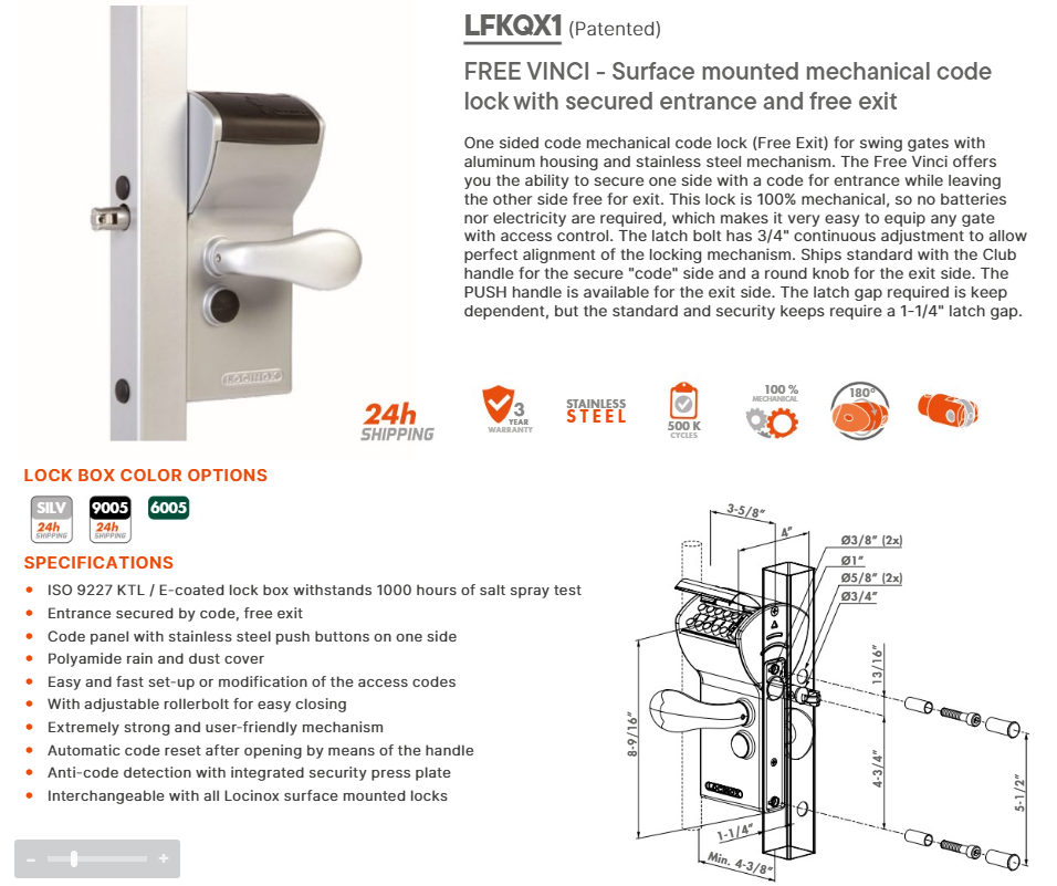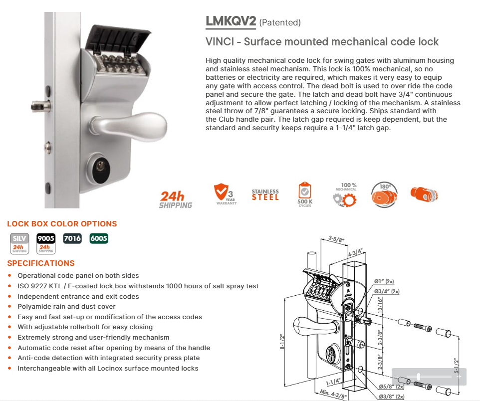 High quality mechanical code lock for swing gates with aluminum housing and stainless steel mechanism. This lock is 100% mechanical, so no batteries or electricity are required, which makes it very easy to equip any gate with access control. The dead bolt is used to over ride the code panel and secure the gate. The latch and dead bolt have 3/4" continuous adjustment to allow perfect latching / locking of the mechanism. A stainless steel throw of 7/8" guarantees a secure locking. Ships standard with the Club handle pair. The latch gap required is keep dependent, but the standard and security keeps require a 1-1/4" latch gap.