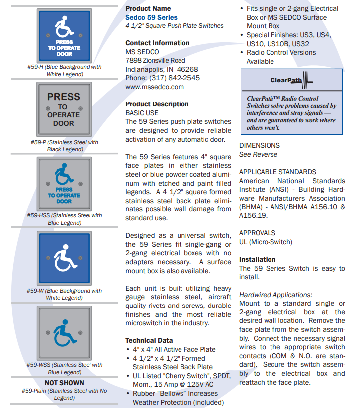 The 59 Series switches combine architectural quality finishes with industrial grade components to provide attractive and reliable automatic door activation.
