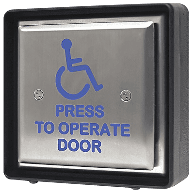 4 1/2 Square; Stainless steel face plate, press to operate door wording.