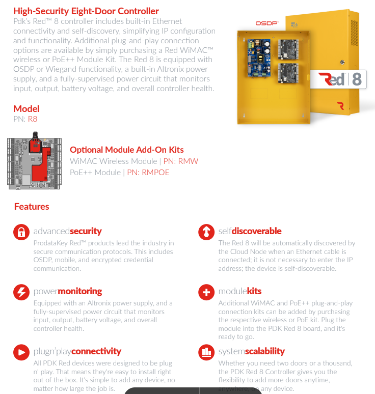 The Red 8 from ProdataKey is a powerful eight-door controller, featuring built-in Ethernet connectivity and self-discovery for simplified install and configuration. With OSDP functionality, a built-in power supply, and advanced power monitoring, the Red 8 ensures a reliable and secure access control performance.