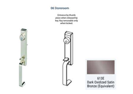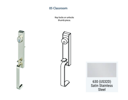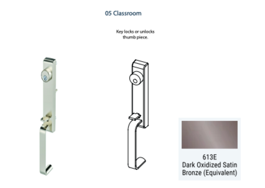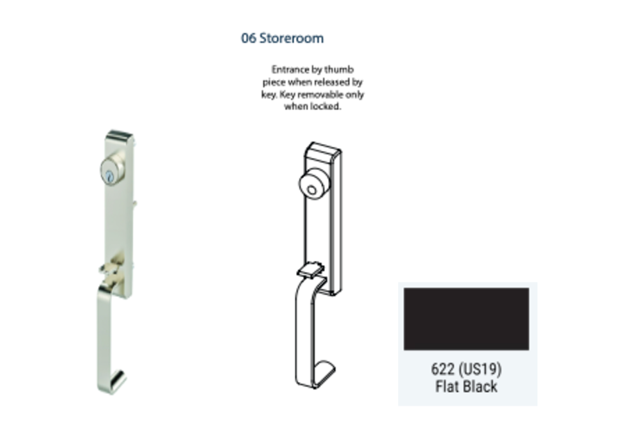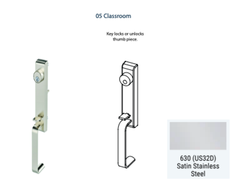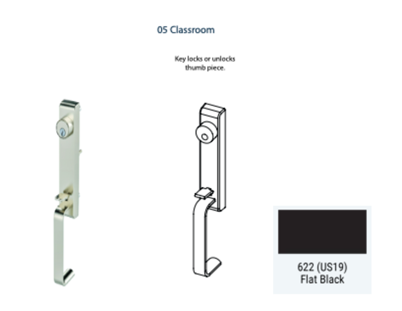 Upgrade your door hardware with the 6T Exit Device Trim, featuring a convenient thumb latch grip designed for 6300 or 6400 Series devices. Available in three functions, it offers ease of operation and added security. Please note, it's not compatible with 6400C narrow stile devices. Talk to a sales rep to elevate your entryway with this sleek and functional thumb latch door hardware, ideal for various commercial applications.