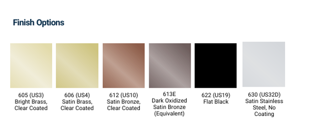 • There are 8 different finishes available: 605(US3), 606(US4), 612(US10), 613E, 622(US19), 626(US26D), 629(US32), 630(US32D)