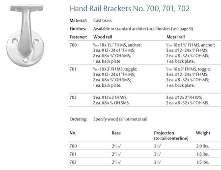 The cast brass 700, 701, and 702 Hand Rail Brackets are expertly designed to provide sturdy support for both wood and metal handrails. These brackets offer a reliable and attractive solution for a variety of handrail applications.