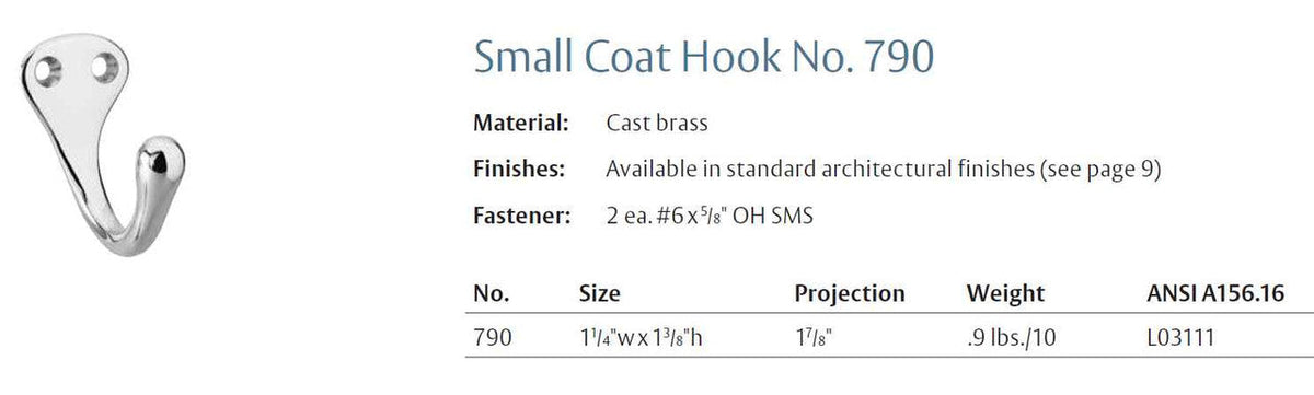 The 790 Small Single Cast Brass Coat Hook has a 1-7/8" projection and sturdy design, allowing you to effectively hang various items.