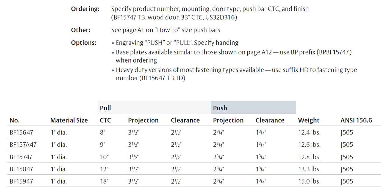 - Ordering: Specify product number, mounting, door type, push bar CTC, and finish (i.e., BF15647 T3, wood door, 33" CTC, US32D316)