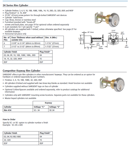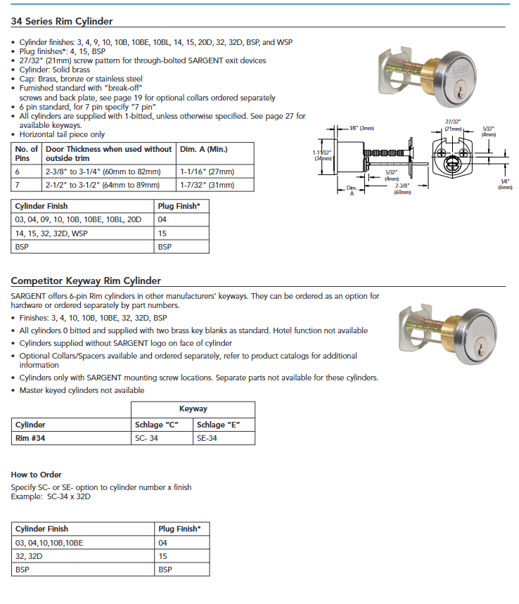 SARGENT offers 6-pin Rim cylinders in other manufacturers’ keyways They can be ordered as an option for