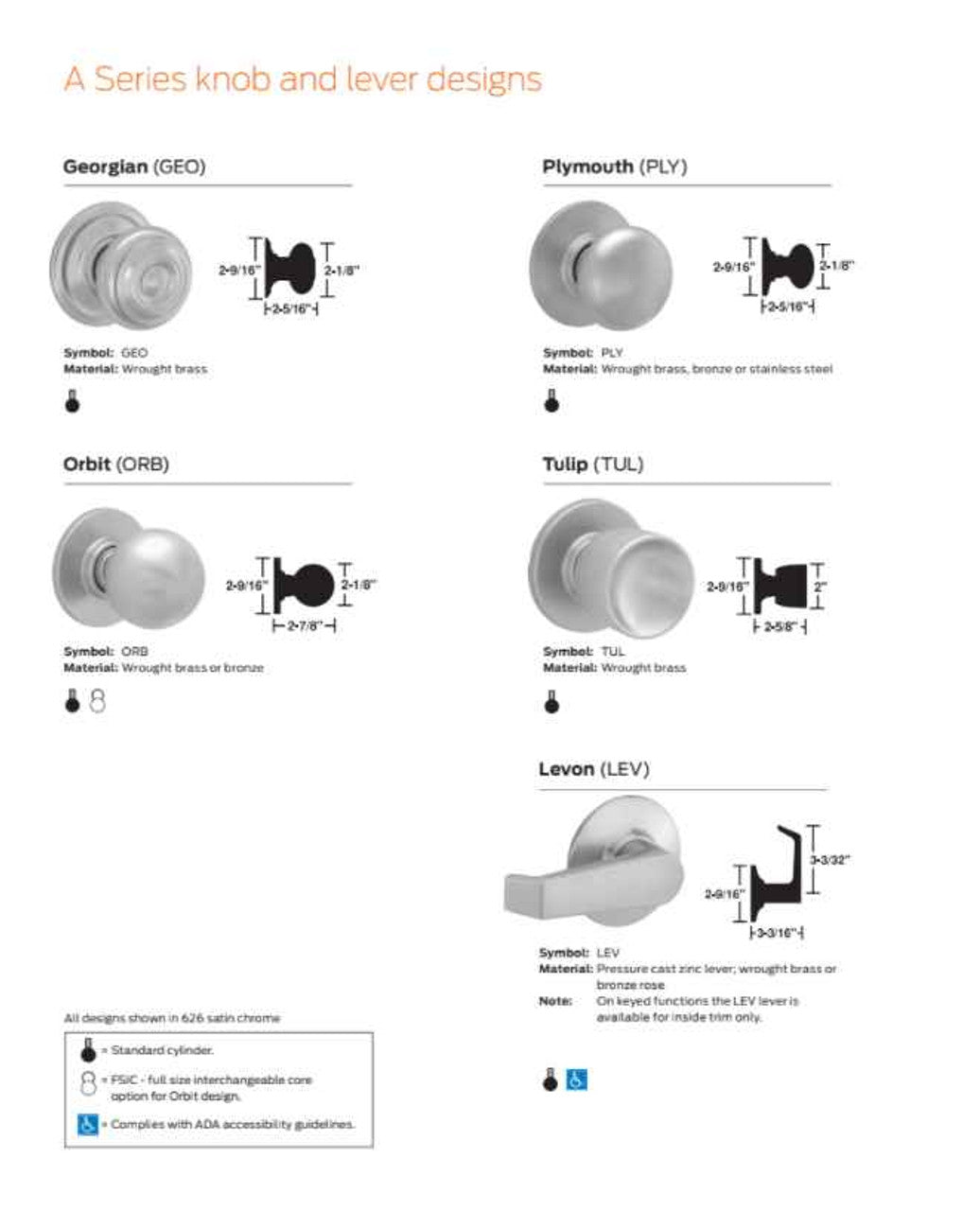 The A Series cylindrical lock is Schlage's first lock and continues to exceed ANSI/BHMA Grade 2 standards, allowing it to be used in a wide range of commercial and residential applications. A Series locks are available in ten finishes and five trim designs allowing it to fit any new or existing environments.