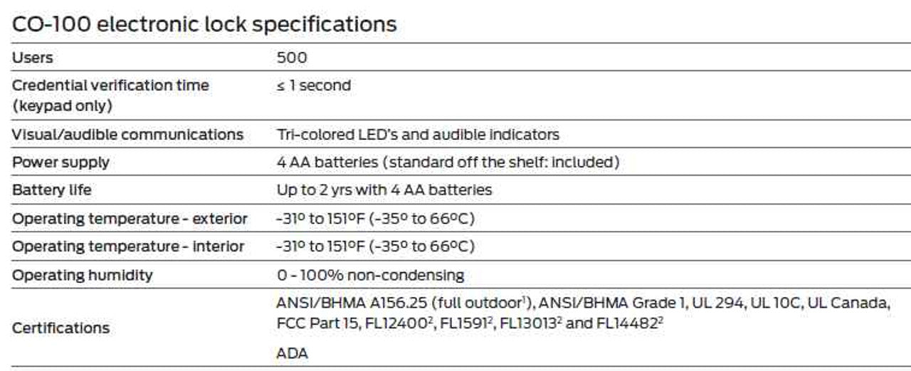 The CO Series provides ideal solutions for customers seeking the added security and convenience of electronic access control without the cost or complexity of a fully networked system. Within this group is CO-100, a standalone lock that is manually programmable. User rights are stored on the lock with unique PIN codes assigned to each user. This minimizes the number of mechanical keys issued which protects the integrity of your key system. PIN codes can be easily added or deleted at anytime, right at the door.