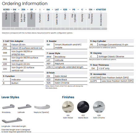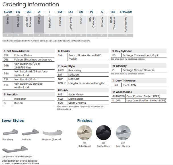 The XE360 exit trim is currently compatible with rim and surface vertical rod styles of the following exit devices: