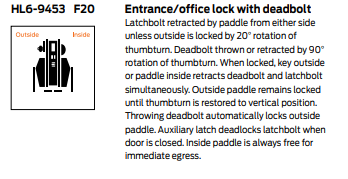 - HL6-9456 Corridor lock with deadbolt (ANSI F13) and optional key override feature
