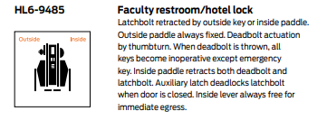 - HL6-9485 Faculty/hotel restroom lock with deadbolt and optional key override feature