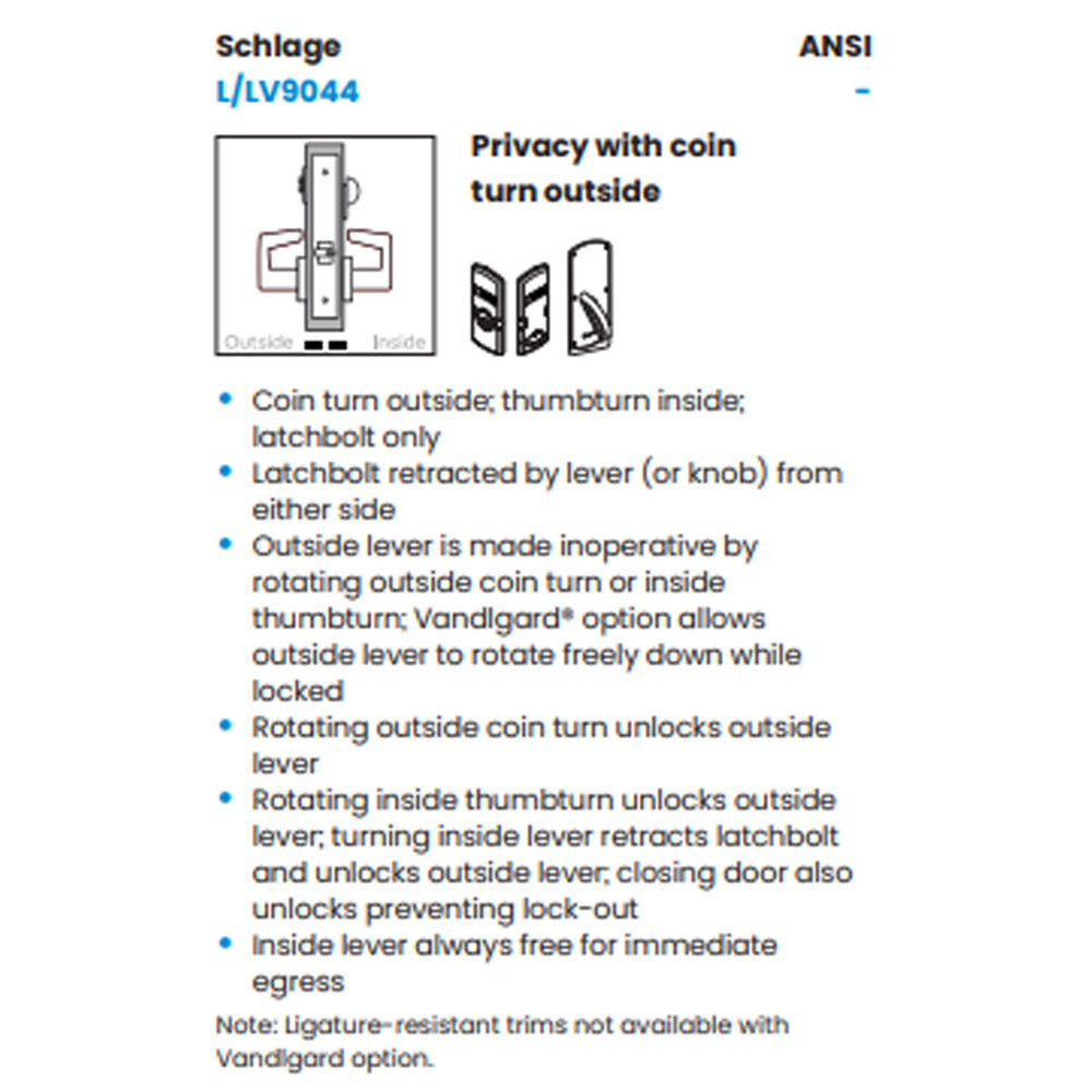 Schlage L9044 - Grade 1 Privacy with Coin Turn Mortise Lock, Exterior Indicator "Locked/Unlocked"