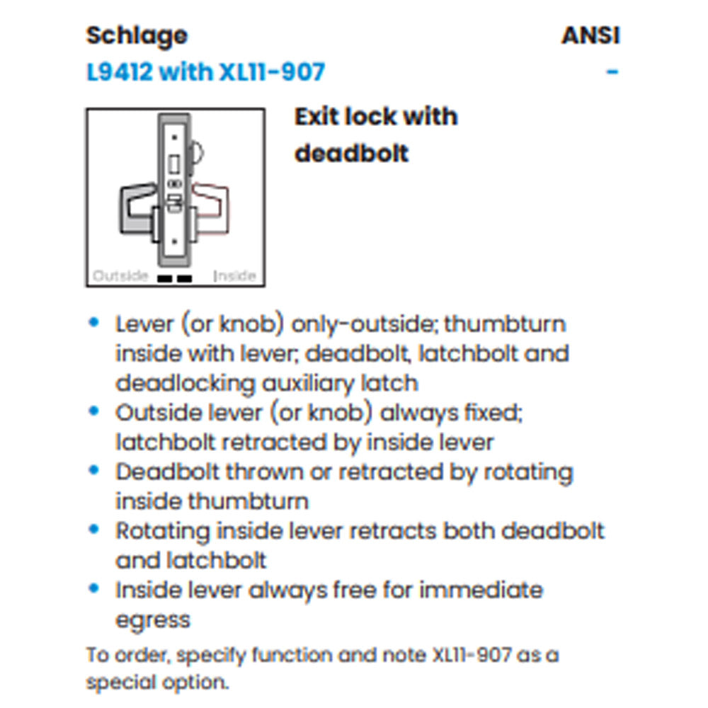 Schlage L9412 - Exit Lock with Deadbolt - Grade 1 Mortise Non-Keyed Lever Lock