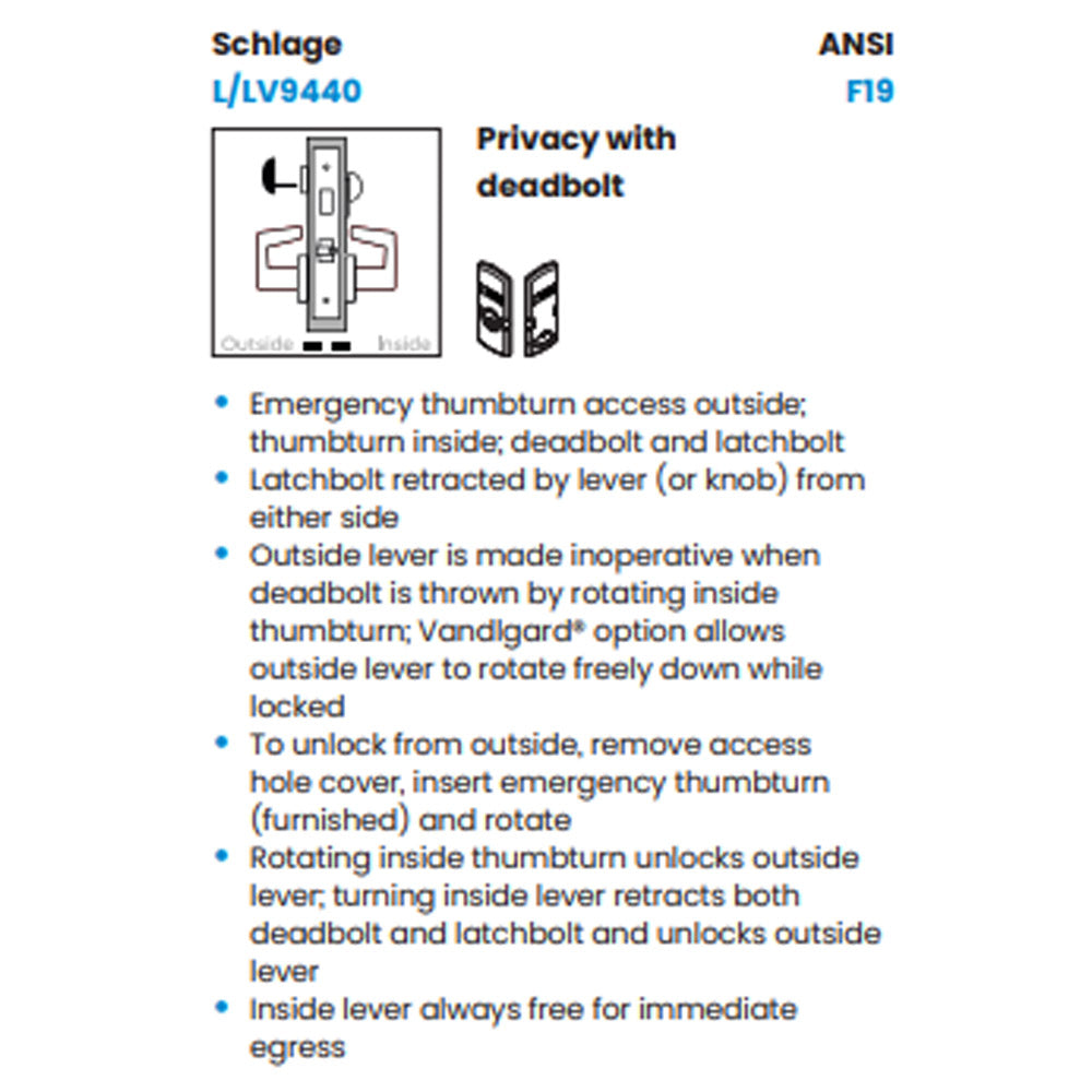 Schlage LV9440 - Grade 1 Vandlgard Privacy With Deadbolt Mortise Lock, Non-Keyed, Interior Indicator Displays "Locked/Unlocked"