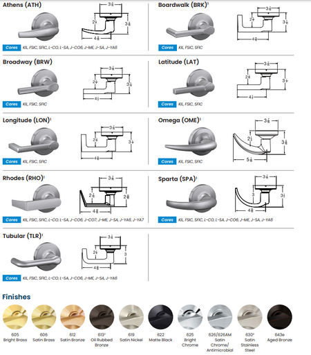 • All levers with a return to door of 1/2" (13 mm) or less comply (Rhodes, Sparta, Tubular, Omega, Longitude, and Boardwalk)