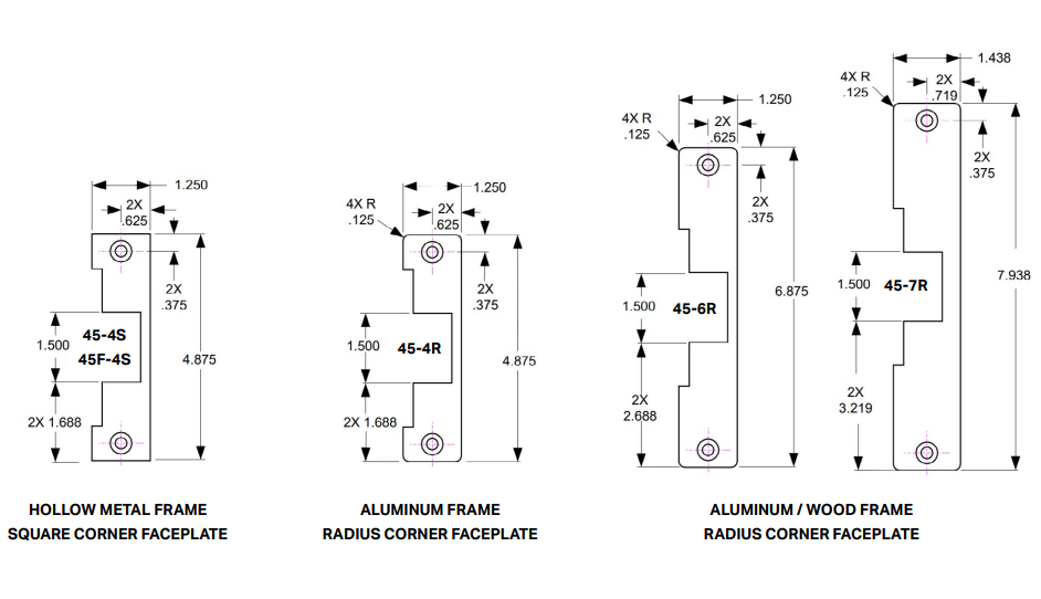 45F models are fire-rated and accept 9/16” throw latchbolts or up to 5/8” throw latchbolts with 1/8” door gap.