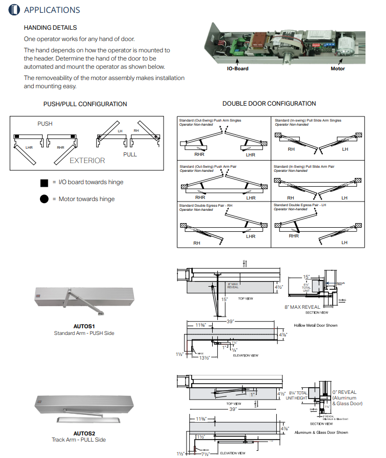 SDC’s operator is built with a state-of-the-art microprocessor-based unit that is self-tuning and self-learning while offering nonhanded operation, full-mechanical stops, and a variety of interface options for sensors, push-plates, fire alarms and electrified locks.
