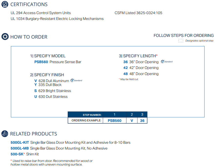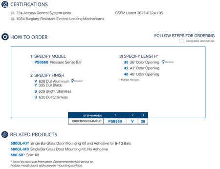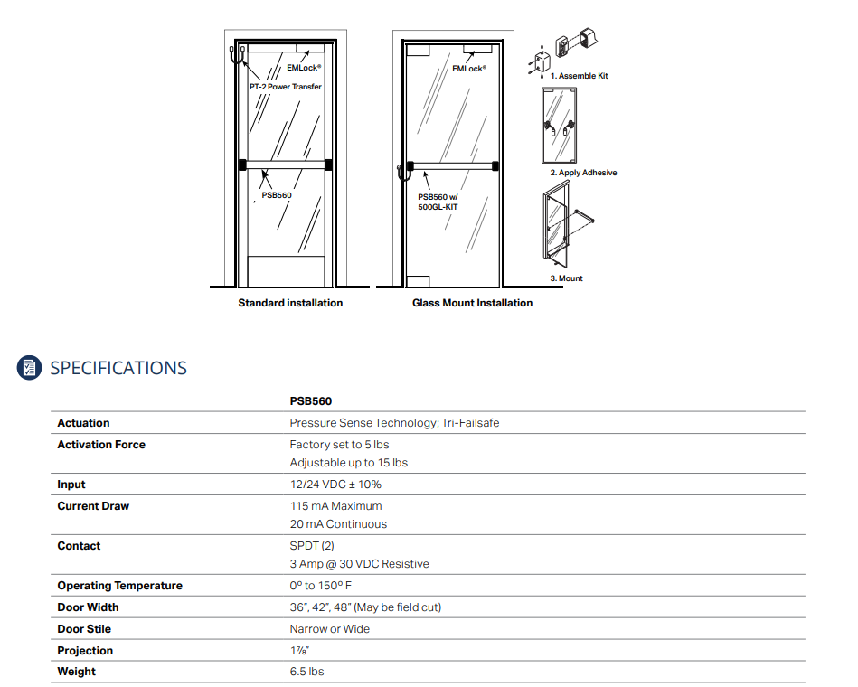 Stable and reliable pressure sense technology. Building codes essentially state that egress through access-controlled doors must not require prior knowledge of operational requirements. Meeting this criteria, SDC’s patented SureExit® PSB560 series pressure sense bars are designed to release electromagnetic door locks for uninhibited egress. When slight pressure is applied to the non-latching bar, either of the two redundant solid state pressure sensors are actuated causing the electronics to immediately release the electromagnetic door locks.
