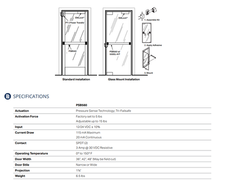 The PSB560 series uses heavy duty aluminum extrusion and metal caps. The mounting assembly is all metal, and no plastic. The rigid construction prevents any malfunction due to sagging or warped doors or tweaked glass door stiles. With no moving parts the pressure sense technology does not suffer wear and provides quick and quiet operation.
