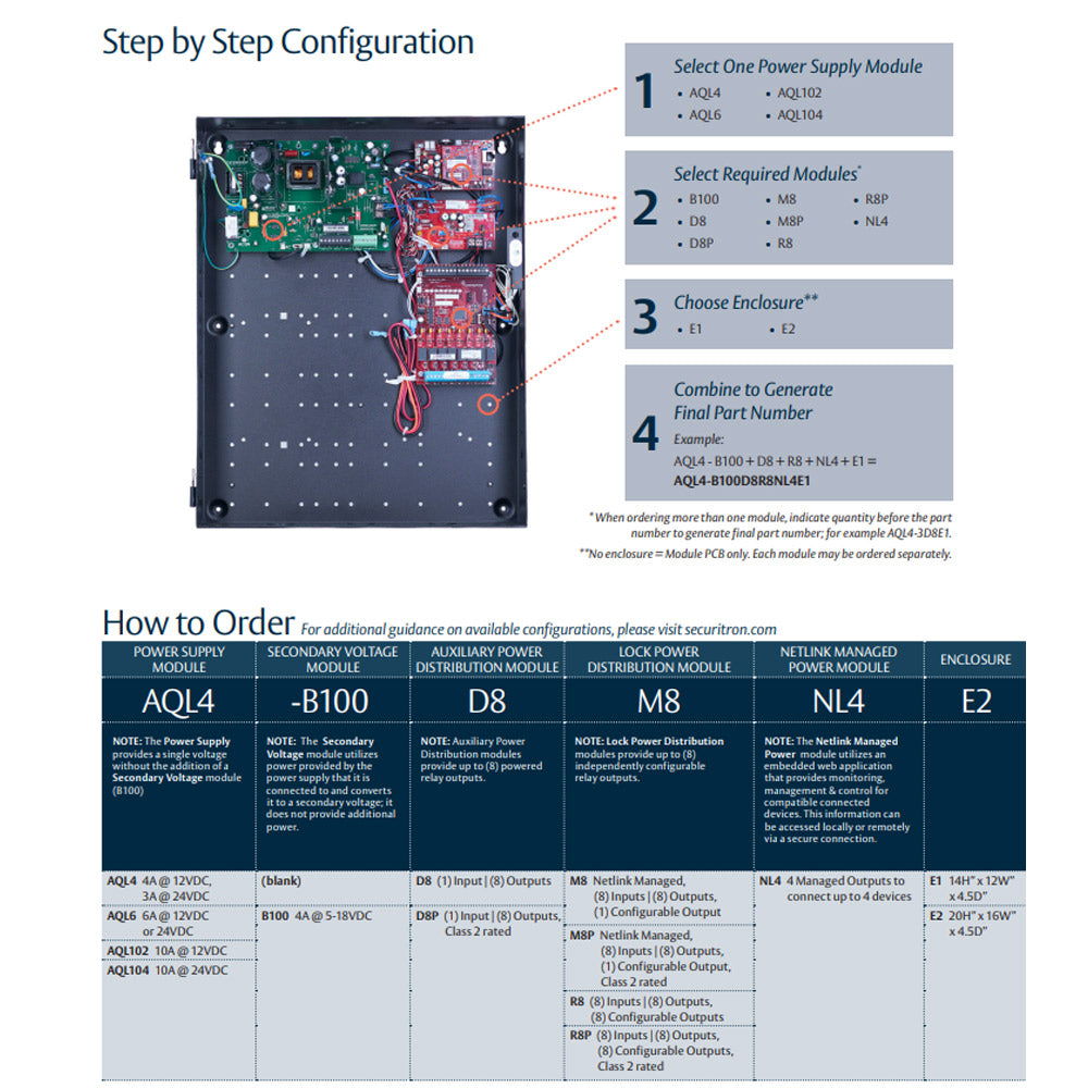 The UL-listed Securitron AQL4 Series of dual voltage, field selectable switching power supplies provides 4 Amps at 12 VDC or 3 Amps at 24 VDC. Both options can be expanded to support up to 16 outputs and offers a dedicated fast battery charging circuit. Available with factory or field configured optional (B100) multi-voltage and (NL4) network monitoring & control.
