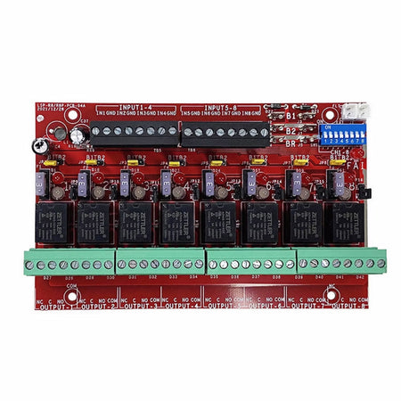 The R8 contains multiple relayed outputs for direct lock control and additional accessory power distribution. The R8 module provides eight access control inputs capable of NO dry contact or open collector activation. It also includes eight relay outputs, programmable for dry or wet contact or powered for failsafe or fail-secure locking devices.