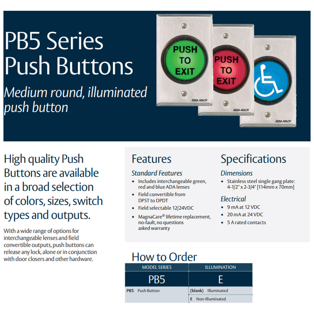 High quality Push Buttons are available in a broad selection of colors, sizes, switch types and outputs. With a wide range of options for interchangeable lenses and field convertible outputs, push buttons can release any lock, alone or in conjunction with door closers and other hardware.