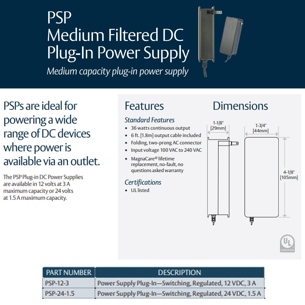 12 volts at 3 Amp max. capacity (model PSP-12-3) and 24 volts at 1.5 Amp max. capacity (model PSP-24-1.5). 6 ft. output cable is included. Input voltage 120 to 220VAC. PSPs are ideal for powering a wide range of DC devices. PSPs are ideal for powering a wide range of DC devices where power is available via an outlet. The PSP Plug-in DC Power Supplies are available in 12 volts at 3 A maximum capacity or 24 volts at 1.5 A maximum capacity.