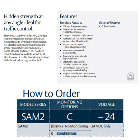 The compact and versatile SAM2-24 Shear Aligning Magnalock provides 600 lbs. of holding force to swinging or sliding doors. It is ideal for traffic control and to secure smaller applications, like sliding closet doors, atriums, and more. The SAM2-24 mounts fully concealed into wood, steel, aluminum or Herculite doors in any position: at the header, door edge or threshold.