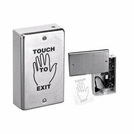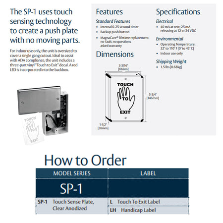 The SP-1 uses patented touch sensing technology to create a push plate with no moving parts. For indoor use only, the unit is oversized so that it can be mounted over a single gang cutout. A three part vinyl decal is included and a red LED is incorporated into the backbox.