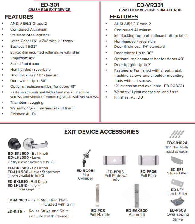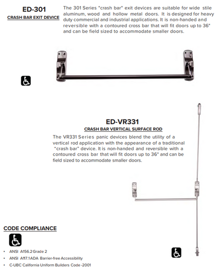 The ED-VR331 panic devices blend the utility of a vertical rod application with the appearance of a traditional panic device. it is non-handed and reversible with a contoured cross bar that will fit doors up to 36".