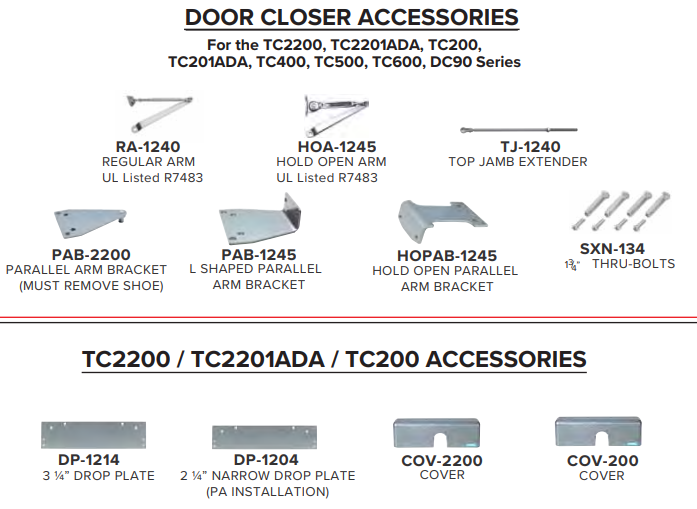 The TC400/500 are recommended for use on commercial, architectural and institutional applications. These models are ideal for business, new construction and renovations. Both models have a full selection of accessories to accommodate the requirements of any door control installation. Fully compliant with opening force requirements for ADA and ANSI/BHMA standards.