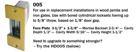 For use in replacement installations in wood jambs and iron gates. Use with bored cylindrical locksets having up to 5/8� throw, based on 1/8� door gap.