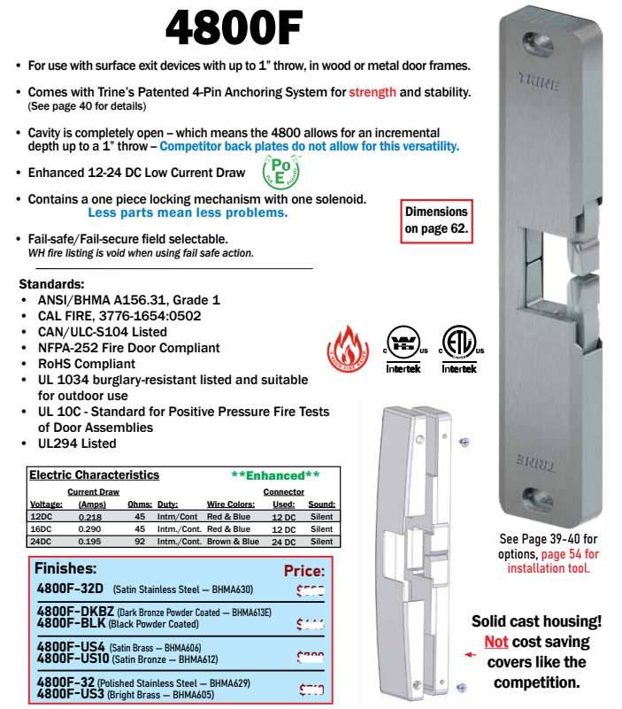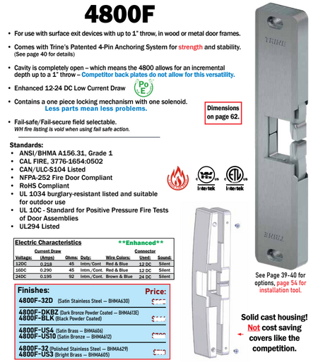 Please note, currently the 4800FLB is not fire rated. If you need latchbolt monitoring for your 3/4" 4800F electric strike go to ⇒ The 4800 Series Accessories Page