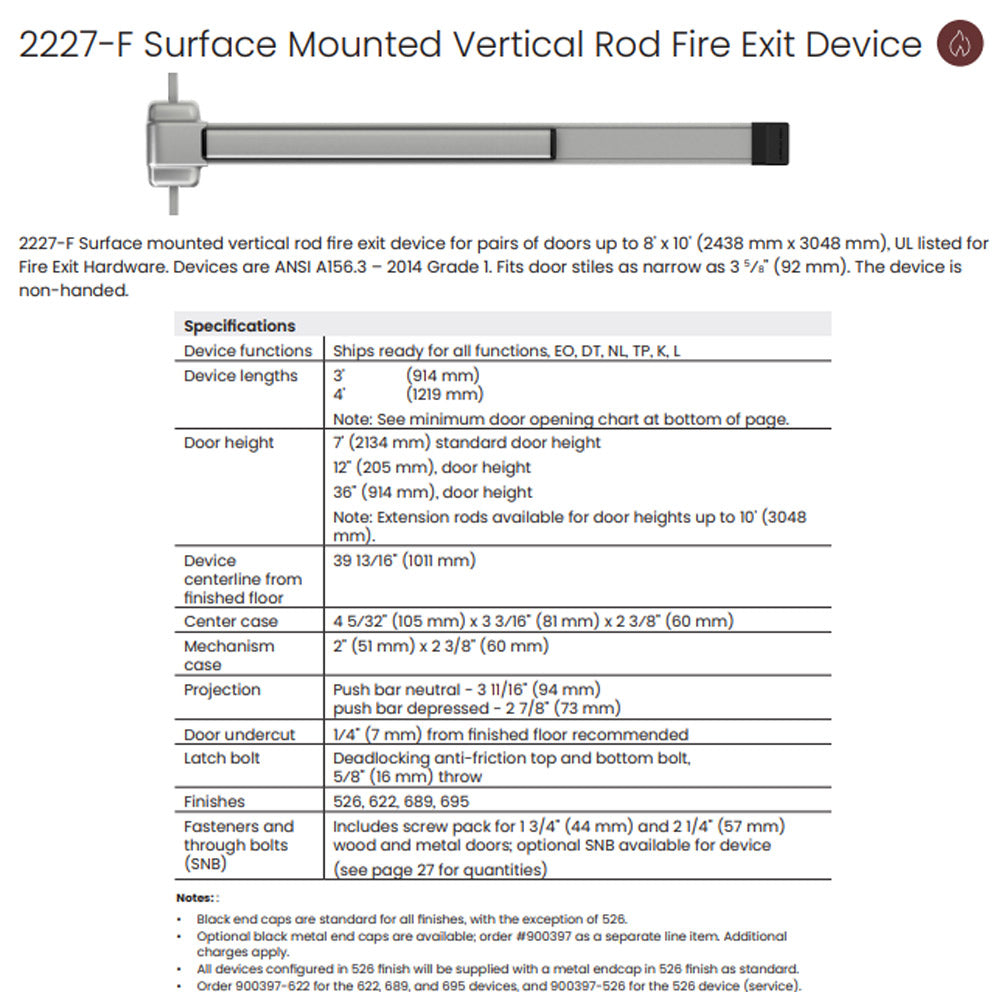 The Von Duprin 2227 Series surface-mounted vertical rod exit device delivers reliable performance and rugged durability, making it an ideal choice for securing single and double doors with a mullion. Designed with modern touchbar styling, the 2227 is UL listed for both Panic and Fire Exit Hardware and meets ANSI/BHMA A156.3-2014, Grade 1 standards for high-traffic commercial applications.