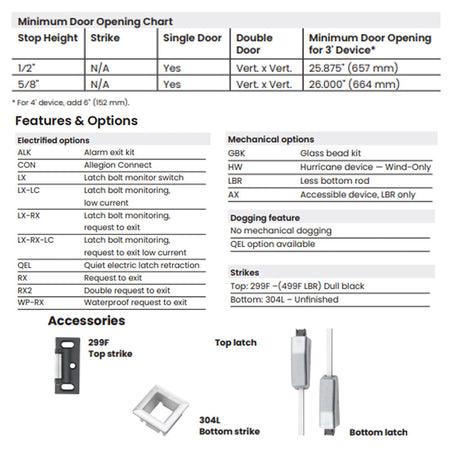 This non-handed device fits door stiles as narrow as 3 5⁄8" (92 mm) and supports door sizes up to 8' x 10' (2438 mm x 3048 mm) with optional extension rods.