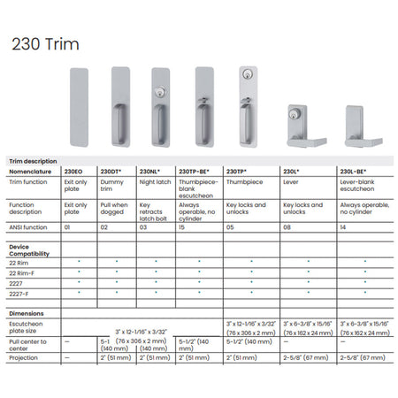 Be sure to order the appropriate cylinder separately for the 230NL, 230TP, and 230L trims.