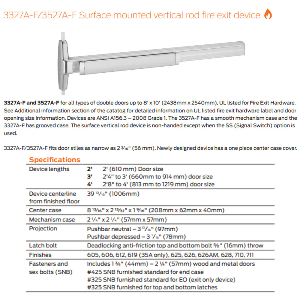 Von Duprin 3327A-EO-F/3527A-EO-F - Exit Only Surface Vertical Rod Device - Fire Rated