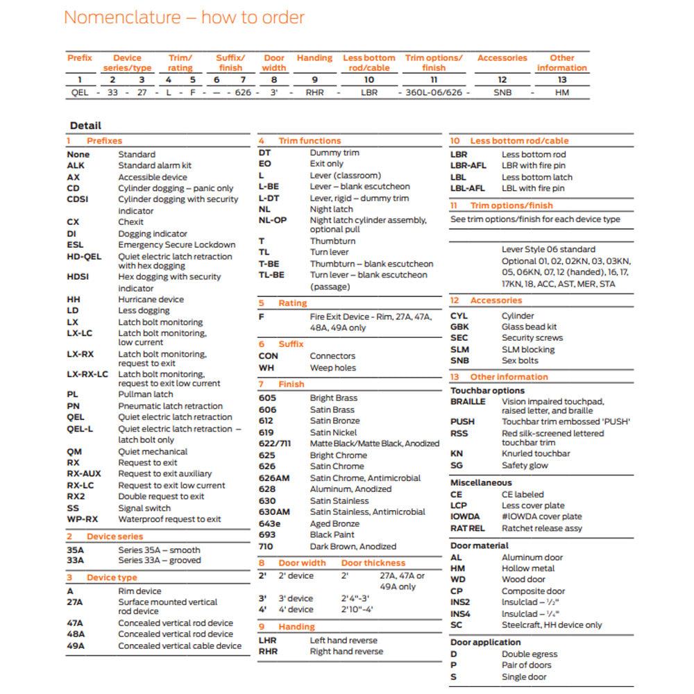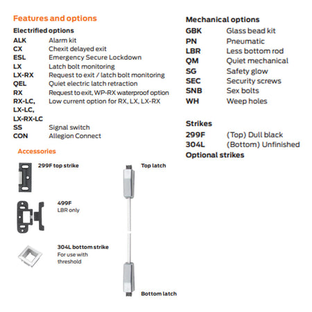 - Electric Options: LX Latchbolt Monitor Switch; RX Pushpad Monitor Switch; RX2 Double Pushpad Monitor Switch; SS Signal Switch; EL Electric Latch Retraction; ALK Alarm Exit Kit