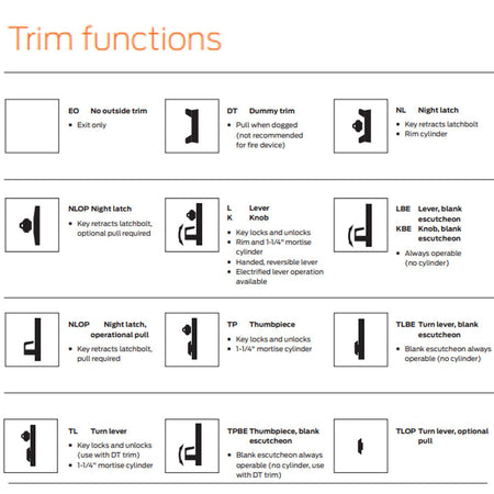 All trim functions are compatible with Von Duprin 33A/35A Series Exit Devices and 75 Series Exit Devices.